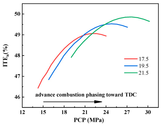 Figure 8 shows the effect of CR on ITEn at different combustion phasings. As the combustion phasing is advanced, the PCP monotonically increases and ITEn first rises and then declines. Peak ITEn increases with elevated CR at the cost of increased PCP. As shown in Figure 9, when PCP is limited to below 20 MPa, the optimum CR is around 17.5. It is attributed to combustion phasing being retarded when CR is elevated. In this case, adjusting the compression ratio cannot improve thermal efficiency.
