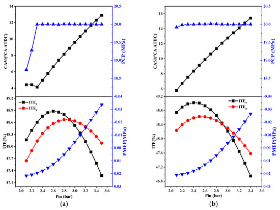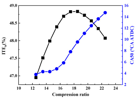 In Figure 14, the CR and the boost pressure are maintained at benchmark values as IVC timing is delayed. CA50 is optimized to achieve the highest ITEn while meeting the PCP constraint simultaneously. As IVC timing is delayed, the effective compression ratio is reduced. As a result, CA50 can be advanced, which contributes to ITEg improvement. In addition, when boost pressure remains constant, the air mass flow rate declines for the decreased volumetric efficiency. This brings changes in two aspects. On the one hand, the reduction in the air mass flow rate leads to advanced combustion phasing and improved pumping working. On the other hand, the combustion lean extent is reduced, which tends to increase heat losses. Consequently, the CA50 moves away from the top death center when the IVC timing is retarded after −80 °CA ATDC. The above phenomenon leads to the results that ITEn obtains a peak value of 49.27% when IVC timing is around −90 °CA ATDC.