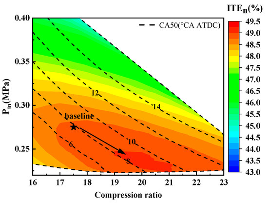To sum up, late IVC timing is shown to be able to mitigate the PCP constraint on CR, boost pressure, and combustion phasing, which leads to higher ITEn. Combining late IVC timing and high boost pressure shows the greatest potential to improve ITEn under the constraint of a 20 MPa PCP. When advancing CA50 or increasing CR with late IVC timing, ITEn improvement is mainly attributed to pumping work improvement, and the air–fuel ratio is reduced. Indeed, the combustion duration would be prolonged when the air–fuel ratio declines [40], leading to an ITEg reduction [36], which could not be captured by the current combustion model. To overcome this disadvantage, the air–fuel ratio is restricted to above the baseline value in the multi-parameter optimization to acquire meaningful results.