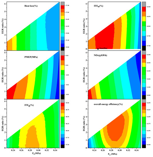 As mentioned in the Introduction, it has been observed that HP EGR can improve pumping work and reduce PCP. There is an interaction among HP EGR, boost pressure, and turbocharging efficiency that makes it difficult to determine the effect of EGR dilution on engine performance. With the convenience of a single turbocharger model, the effect of EGR on engine performance is examined at the condition of constant boost pressure and constant turbocharging overall efficiency. Figure 12 illustrates the impact of EGR dilution on engine efficiency at varying boost pressures. The point at the upper edge of the contour means that the EGR valve is fully opened. The HP EGR ratio is restricted by the pressure difference between the pre-turbine and manifold pressure, which is why the top left section of each figure is blank. From Figure 12, it can be observed that the maximum EGR ratio increases with the increase in boost pressure. When high-pressure EGR is applied, part of the exhaust gas is circulated into the manifold after being cooled rather than going through the turbine for expansion work, which leads to exhaust gas energy loss. The expansion ratio of the turbine would increase to compensate for this loss and to balance the power consumed by the compressor. However, the air mass flow rate is reduced when the EGR ratio increases, as fresh air is replaced by exhaust gas. Therefore, compressor power is reduced when the boost pressure remains unchanged. Consequently, pumping work is subtly improved by increasing the EGR ratio at a constant boost pressure. Although heat losses are expected to decline for EGR diluted combustion as it has a lower combustion temperature, this effect is shown to be negligible for the variation range of the EGR ratio. In addition, exhaust gas leads to a lower in-cylinder charge-specific heat capacity ratio, which reduces conversion efficiency [39]. Hence, ITEg is slightly reduced when the EGR ratio increases. However, this effect is not obvious in the low- and high-boost pressure conditions. Overall, the EGR dilution is found to have a negligible effect on ITEn, while the boost pressure is the critical factor determining ITEn, and peak ITEn is obtained at a 0.245 MPa boost pressure.
