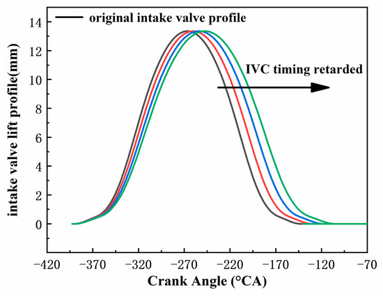 From the previous discussion, it is concluded that CR, boost pressure, and combustion phasing compete as the PCP are restricted. The competition among them leads to limited ITEn improvement. As previously mentioned in the introduction, delayed IVC timing can reduce the effective compression ratio, and could potentially mitigate the constraint of PCP on CR, boost pressure, and combustion phasing. Like the previous discussion, the PCP limitation is set as 20 MPa. The benchmark CR, boost pressure, and IVC timing are 20.3, 0.245 MPa, and −140.5 °CA ATDC, respectively, which achieved the highest ITEn in the previous discussion. Here, the IVC timing is changed by stretching the intake valve lift profile, while the intake valve opening timing remains unchanged. Figure 13 shows the valve lift profiles for different IVC timing.