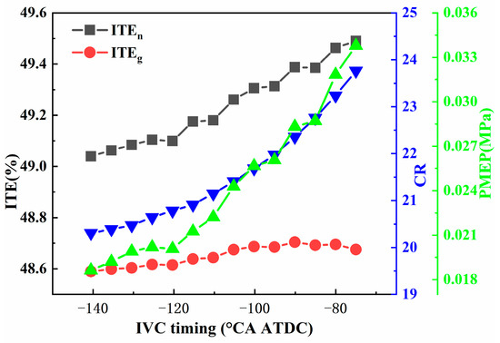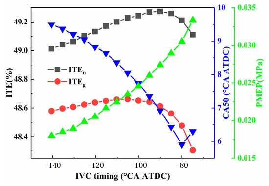 In Figure 15, the CA50 and the boost pressure are maintained at benchmark values as IVC timing is delayed. CR is optimized to achieve the highest ITEn while complying with the PCP constraint. Figure 15 shows that ITEg only obtains a 0.1% increment while CR significantly increases. Moreover, ITEg tends to decline after IVC −90 °CA ATDC. This is attributed to an increase in heat loss owing to the reduction in combustion lean extent. In addition, pumping work is obviously improved for the reduction in volumetric efficiency. As a result, ITEn monotonically increases as IVC timing is delayed. The peak ITEn value is 49.49%, achieved by retarding IVC timing within the studied range.