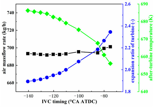 Like Figure 14 and Figure 15, the CA50 and the CR are maintained at benchmark values as IVC timing is delayed in Figure 16. Pin is adjusted to achieve the highest ITEn while fulfilling the PCP constraint. In Figure 16, ITEg and ITEn are monotonically improved with delayed IVC timing and elevated boost pressure. Since the CA50 and expansion ratio in the expansion stroke remain constant, the ITEg increment is attributed to the reduction in compression work in the compression stroke for the reduced effective compression ratio. As seen in Figure 10, pumping work deteriorates considerably due to the high boost pressure, while pumping work is improved with elevated boost pressure in Figure 16. To illustrate the PMEP trend in Figure 16, the air mass flow rate, expansion ratio of the turbine, and after-turbine temperature are given in Figure 17. While boost pressure and air mass flow rate increase simultaneously in the first case, boost pressure increases with a nearly constant air mass flow rate in the latter case. Seen from the turbine expansion ratio and after-turbine temperature trends in Figure 17, it could be concluded that more exhaust enthalpy is recovered to provide the power needed to compress air to a high boost pressure when the air mass flow rate remains nearly constant. Thereby, pumping work is improved in Figure 16. In conclusion, combining late IVC timing and high boost pressure is beneficial to improve ITEn. The peak ITEn value is 49.56%, achieved by retarding IVC timing within the studied range.
