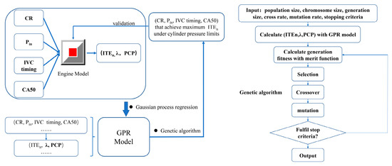 Based on above parametric analysis, CR, boost pressure, and IVC timing should be co-optimized to achieve the maximum ITEn under a PCP-limited condition, which is a multi-parameter optimization problem. The normal practice is combining the 1D engine model and a Genetic Algorithm to find the optimum parameter combinations. However, running one case in a full engine model costs eight to ten minutes on one CPU core, which implies that the solution search procedure will be time-consuming and computation-demanding. In order to accelerate the optimization procedure, a hybrid method is used by replacing the full engine model with a mathematical model, as shown in Figure 18.