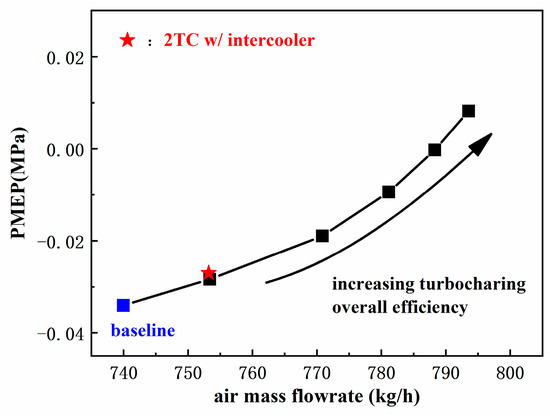To validate the thermal efficiency improvement strategy, the original engine configurations is upgraded according to the optimization results. Table 9 shows the engine specification comparison. A two-stage turbocharger (2TC) with an intercooler is applied to achieve a high boost pressure. In 2TC system, turbocharging overall efficiency is not appropriate to characterize the air system performance, owing to a part of the air enthalpy being carried away by the coolant inside intercooler. From the perspective of improving thermal efficiency, the air mass flow rate and PMEP can be used to describe the air system performance. Using the 1D engine model, the effect of turbocharging overall efficiency and the 2TC system on the air mass flow rate and PMEP is compared in Figure 20. In the 2TC system, the compressor and the turbine isentropic efficiency are assumed to remain at baseline values, and the compressed air temperature after the intercooler is controlled to 40 °C. In the single turbocharger air system, PMEP is improved and combustion lean extent is raised, when the turbocharging overall efficiency rises. Likewise, the air mass flow rate and PMEP of the 2TC with an intercooler are also improved compared to the baseline single turbocharger system. So, the application of a 2TC with an intercooler has similar effects to increasing turbocharging overall efficiency in practice, even if the isentropic efficiency of turbocharger is not improved. Apart from the air system, the combustion system is also upgraded. The CR and IVC timing are set as 21.5 and −92 °CA ATDC, which do not strictly follow the optimization results but basically comply with the principle of the thermal efficiency improvement strategy. In addition, the high-pressure EGR valve is kept fully open.