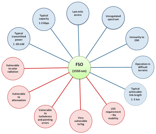 - Al-Gailani, S.A.; Salleh, M.F.M.; Salem, A.A.; Shaddad, R.Q.; Sheikh, U.U.; Algeelani, N.A.; Almohamad, T.A. A survey of free space optics (FSO) communication systems, links, and networks. IEEE Access 2020, 9, 7353–7373. [Google Scholar] [CrossRef]