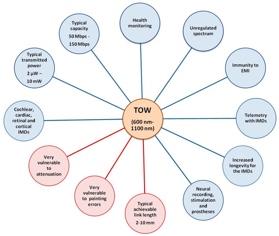 - Boulogeorgos, A.A.A.; Trevlakis, S.E.; Chatzidiamantis, N.D. Optical wireless communications for in-body and transdermal biomedical applications. IEEE Commun. Mag. 2021, 59, 119–125. [Google Scholar] [CrossRef]