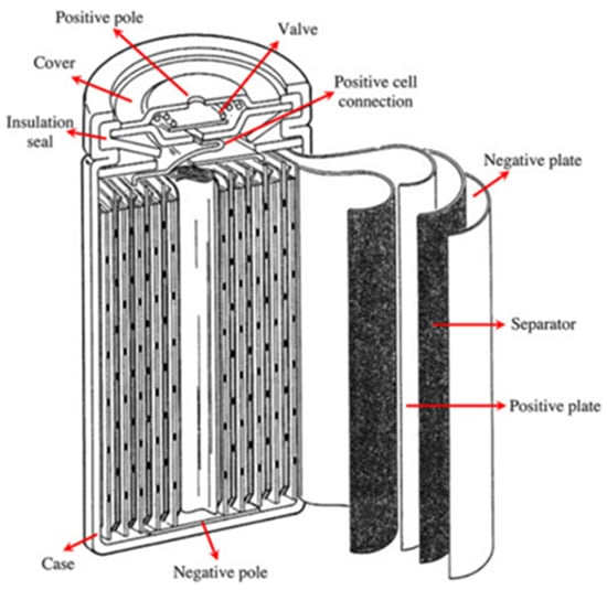 The nominal voltage of NiMH is 1.2 V. The open-circuit voltage is between 1.25 V and 1.35 V. The discharge cut-off voltage is 1 V. NiMH batteries are usually made in valve-regulated models to allow for the release of gas during overcharging and short-circuit conditions. NiMH’s operating temperature range is between 0 °C and 40 °C. Operating NiMH at high temperatures reduces its performance due to increased internal resistance. NiMH batteries raise no environmental concerns, and their disposal is not difficult. They have up to 40% higher specific energy than NiCd [25]. NiMH batteries also have a long cycle life, a long calendar life, and high safety performance. The major drawbacks of NiMH are the memory effect, high self-discharge rate, high cost, inability to support a very high C-rate (greater than 5 C) for charging and discharging, and the need for a complex charging regime. However, the memory effect in NiMH is not as pronounced as in Ni-Cd. By altering the hydride alloy, the self-discharge rate can be reduced, which also reduces the corrosion of the alloy but also decreases the specific energy of the battery. Also, it is reported that there is little room for an increase in the power and energy densities of NiMH, and the high cost is not expected to drop significantly with increased production [26]. Sealed NiMH cells are manufactured in a cylindrical and prismatic way. The general schematic of a NiMH cell is shown in Figure 6.
