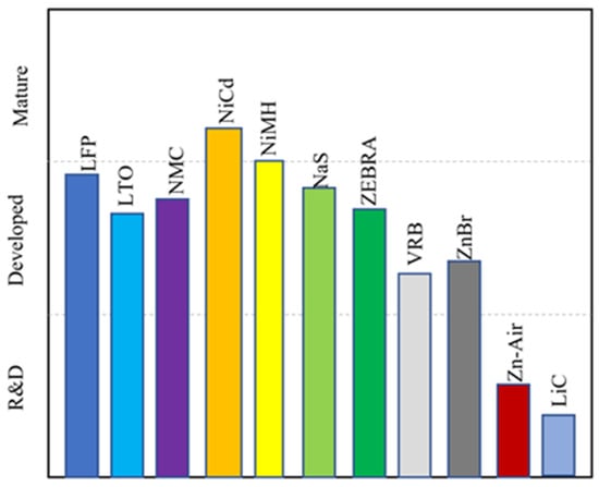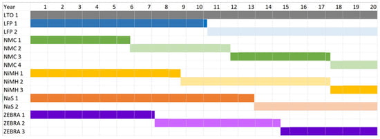 The battery chemistries that are considered in detail in this work include Li-ion (lithium iron phosphate (LFP), lithium titanate (LTO), lithium nickel manganese cobalt oxide (NMC)), nickel cadmium (NiCd), nickel metal-hydride (NiMH), sodium sulfur (NaS), sodium nickel chloride (ZEBRA), flow batteries (vanadium redox (VRB) and zinc bromine (ZnBr)), metal-air (zinc air), and lithium-ion capacitor.
