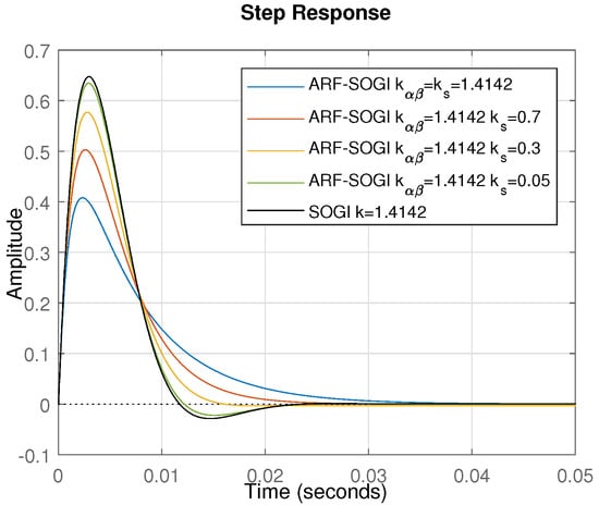 The step responses shown in Figure 2 correspond to transfer function (2), which defines the behavior of the implicit bandpass filter in the ARF-SOGI compared with the transfer function representing the same filtering effect in the SOGI. Although the behavior of the low-pass filter of the ARF-SOGI is not shown, the effect of the gain is the same, meaning a reduction in overshoot and faster response compared to the SOGI-QSG while improving the stability of the pre-filter. In Figure 2, it can be seen that the ARF-SOGI reduces the overshoot of the pre-filter and achieves shorter stabilization times compared to the original SOGI-QSG. The intention is to incorporate this behavior of the ARF-SOGI into the response of the ARF-DSOGI. The details of obtaining the model and transfer functions of the ARF-SOGI-QSG can be found in [23].