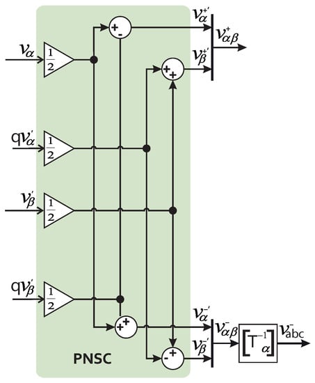 Figure 3 illustrates the implementation of the ARF-DSOGI pre-filter, consisting of two ARF-SOGI filters similar to those used in DSOGI [5]. The algorithm shown in Figure 3 is thus a modification of the DSOGI presented in [5,24]. The first ARF-SOGI generates the signal, while the second generates the signal, which are then fed into either the Park transformation or the sequence components calculator. Figure 4 depicts the positive and negative sequence calculator (PNSC) [24]. In the implementation of ARF-DSOGI-PLL, it is not necessary to utilize the entire PNSC; only the section responsible for extracting the positive sequence components must be employed, reducing the computational cost of the final implementation.