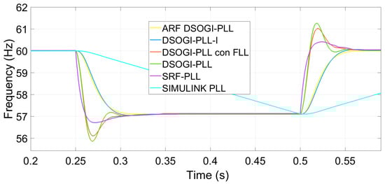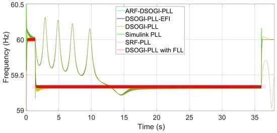 With a wide band tuning like S2, frequency measurement oscillations are expected due to degradation in the quality of the unit vectors of each PLL. A smooth behavior in frequency measurement is desired, and therefore, bandwidth S1 in the control loops of the PLLs is preferred for EPS synchronization applications. To show the measurements of each algorithm under harmonic contamination of THD = 4.99%, the S1 tuning is chosen. Figure 14 shows the frequency measurement performed by the PLLs in this case when applying a step frequency deviation in the EPS.