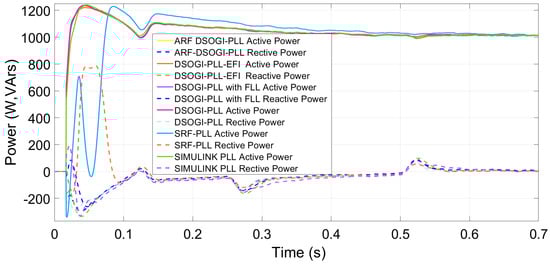 In this simulation, the inverter is assigned the task of regulating the injected active power to 1000 W and the reactive power to 0 VARs. Figure 7 shows the influence of the synchronization algorithm on power regulation. It can be observed that the SRF-PLL results in the worst performance of the inverter in controlling active power not only in the transient response of the inverter but also in the steady-state response. The SRF-PLL is also reported to have the worst harmonic rejection among the algorithms used, as shown in Table 3.