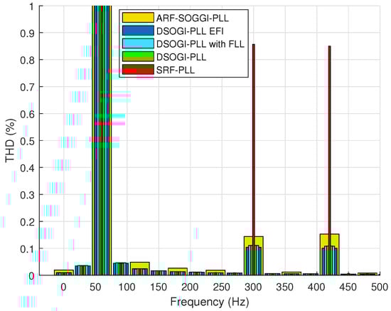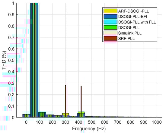 The ARF-DSOGI-PLL, besides having a faster transient response, also provides a better regulation of active and reactive powers. The DSOGI-PLL-EFI exhibits the highest overshoot in the reactive power transient response, while active power is regulated almost equally to the other algorithms. The response of DSOGI-PLL and DSOGI-PLL with FLL is similar to that of ARF-DSOGI-PLL. The SRF-PLL synchronizes and measures the frequency adequately in 78.779 ms, but it exhibits the worst harmonic rejection among the algorithms used in this study. Figure 8 shows this, and even though the THD reported in the case of tuning S1 is 0.41%, increasing the bandwidth of the SRF-PLL worsens the rejection of harmonic content. On the other hand, the Simulink PLL demonstrates a better rejection of harmonic content with a THD of only 0.01%. This can be seen in Figure 8. The Simulink PLL has good angle tracking but with higher error compared to ARF-DSOGI-PLL, and it takes much longer to report the correct frequency as shown in Figure 6. Table 3 shows the THDs of the unit vectors for each algorithm tuned with S1.