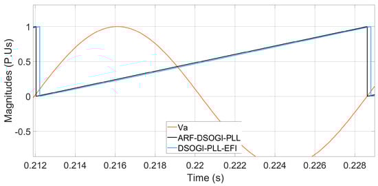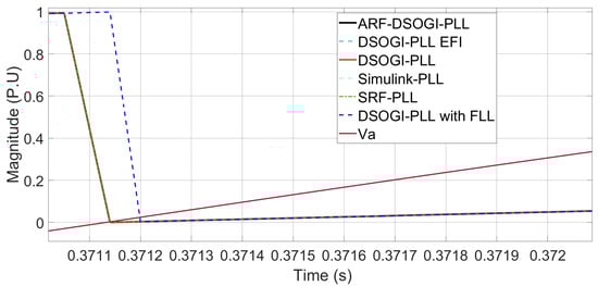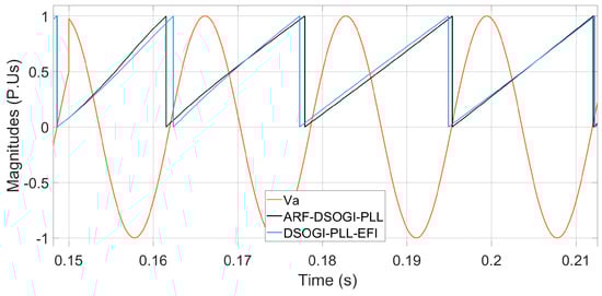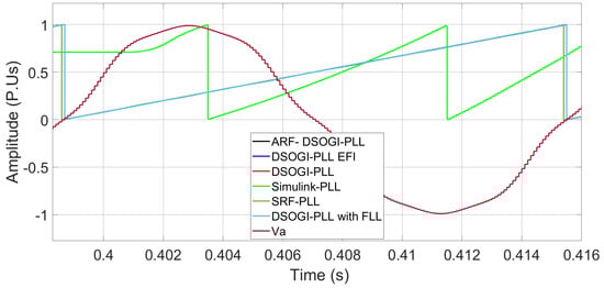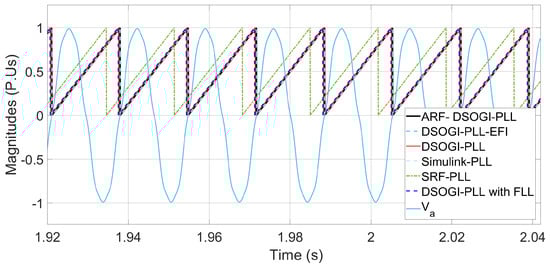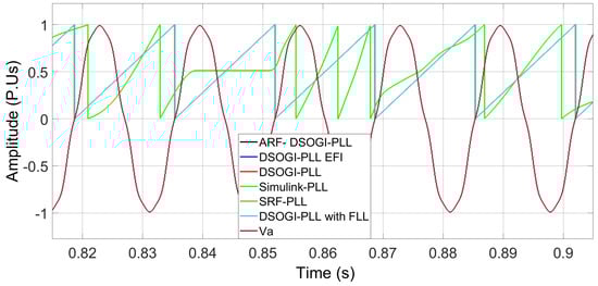 Figure 12 indicates that the Simulink PLL is no longer able to follow the phase angle with a wide bandwidth in the loop filter and that the SRF-PLL algorithm reports the highest error in phase angle tracking, while the other algorithms exhibit a lower error. The rest of the PLL algorithms already exhibit complete synchronization, as shown in Figure 13.