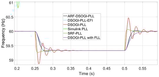 In Figure 10, it can be observed how the ARF-DSOGI-PLL and the DSOGI-PLL-EFI exhibit a better transient response in frequency measurement compared to the other PLLs, all with the same wide bandwidth (S2). The frequency deviation, in the form of a step, is −0.67 Hz, starts at t = 0.25 s and ends at t = 0.5 s. It can be seen that during and after the disturbance, all algorithms synchronize except for the Simulink PLL. The SRF-PLL is the first to synchronize with a slight overshoot; however, it also has a low harmonic content rejection capability. On the other hand, the DSOGI-PLL exhibits a transient measurement with significant error due to oscillations. Thus, only three algorithms demonstrate the ability to tolerate wide bandwidths in their loop filter. Table 5 presents the timing of each tested synchronization algorithm in this study under S2 tuning. The Simulink PLL no longer provides accurate frequency measurements; therefore, it is not reported.