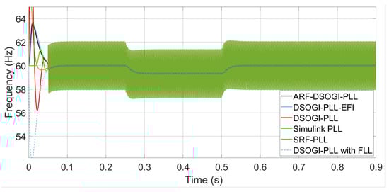 In Figure 6, it can be observed that when a frequency deviation of −2.9 Hz occurs, the Simulink PLL takes 249.959 ms to report the correct frequency value with the loop filter tuning suggested by Simulink for optimal performance. This response is the slowest compared to the other PLLs. The synchronization times and the correct frequency measurement of the other PLLs are shown in Table 2. When the loop filter bandwidth is approximately 166 (rad/s), the ARF-DSOGI-PLL algorithm is the fastest to synchronize and accurately measure the frequency without exhibiting overshoot. This provides confidence that transient error in the frequency measurement will not cause the inverter to trigger due to incorrect frequency measurements.