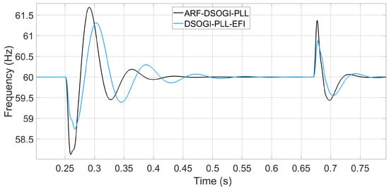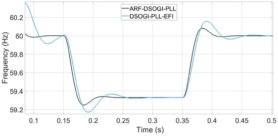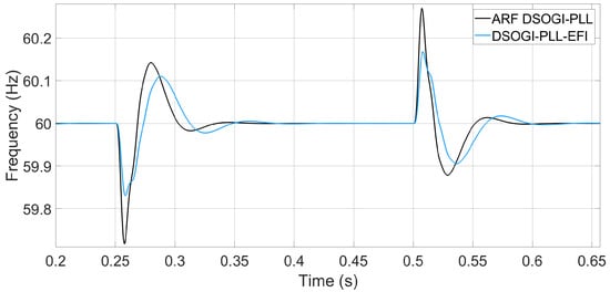 Now, the algorithms are tested against a frequency deviation of −0.67 Hz. For these tests, not only are the tuning parameters of the PLL loop filters changed but also the tuning of the ARF-DSOGI and DSOGI pre-filters. The intention behind this is to assess the operational differences between the two algorithms. Figure 19 shows the frequency measurements of the PLLs when a step-like frequency deviation of 0.67 Hz occurs in the EPS voltage. The ARF-DSOGI-PLL and DSOGI-PLL-EFI algorithms report measurement times of 46.808 ms and 88.808 ms, respectively. These measurements fall within a maximum steady-state error band of 20 mHz.