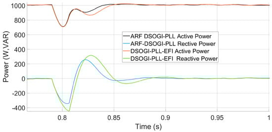 The algorithms are next subjected to a phase jump of 72 degrees, and angle tracking and frequency measurement are verified. Figure 20 shows the angle tracked by the algorithms when the phase jump occurs. It can be observed that from the start of the disturbance at t = 15 s, the ARF-DSOGI-PLL better tracks the phase angle. The ARF-DSOGI-PLL synchronizes within the third cycle after the phase jump, while the DSOGI-PLL-EFI appears to synchronize within the fourth cycle. In Figure 21, it can be observed that in the following cycle, the DSOGI-PLL-EFI loses synchronization while the ARF-DSOGI-PLL remains locked. The ARF-DSOGI-PLL achieves synchronization within the third cycle after the phase jump, while the DSOGI-PLL-EFI achieves synchronization within the fifth cycle. In Figure 22, it can be observed that the effect of the reference angle calculated by the ARF-DSOGI-PLL on power injection is the reduction in transient oscillations in the power injected by the grid-following inverter to the power system during the phase jump. It is also observed that power regulation, especially reactive power, is achieved in less time compared to power injection using the same inverter with the DSOGI-PLL-EFI synchronization algorithm.