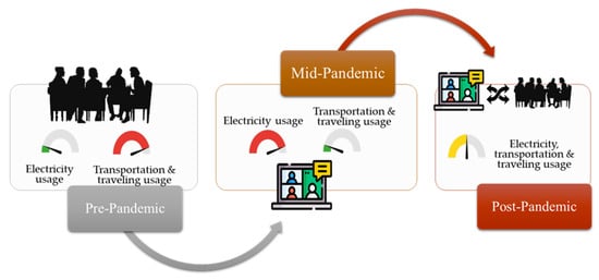 Figure 3 shows different timeframes and the use of communication mediums. Before the pandemic happened, face-to-face communication was the normal or usual way for humans to communicate. Face-to-face communication requires the physical presence of an individual and may involve the use of transportation and buildings, which contribute to low electricity usage but high energy usage on transportation and traveling. In contrast, electronic communications medium such as telephone calls, emails, and online meetings can be conducted remotely and may have a lower energy footprint []. During the COVID-19 pandemic, the medium through which human communication occurred has had an impact on energy consumption. One key trend during the pandemic was the shift towards electronic communication mediums, such as telephone calls, emails, and online meetings, which can be conducted remotely and may contribute to lower energy footprint compared to face-to-face communication. Zoom reported that it had surpassed 300 million daily meeting participants in April 2020, which was up from 10 million daily meeting participants in December 2019 []. In addition, more than 91% of registered students worldwide were affected by the closure of academic institutes, according to the United Nations Education, Scientific and Cultural Organization (UNESCO). Thus, they shifted to online/virtual meeting due to the need for social distancing and the widespread adoption of remote work and online education. In addition, the way in which different communication mediums are used can also impact energy usage. The use of energy-intensive devices such as laptops and smartphones can contribute to energy consumption []. For example, using a laptop or desktop computer with a high-performance processor can result in a higher energy usage than a smartphone or tablet with a lower-powered processor. This is also proven by the increase in electricity in the residential area as people were required to stay at home.