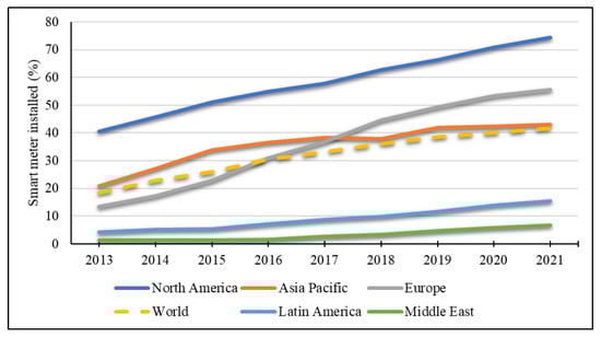 To increase the precision and dependability of data on energy usage, smart meters with digital technology have also been widely adopted [,,]. In 2020, the International Energy Agency reported that as of the end of 2019, over 27% of all power users worldwide have smart meters installed in their homes. By the end of 2025, this figure is anticipated to reach over 50%. Figure 4 shows the percentage of electricity customers in different regions with a smart meter installed []. The deployment rate of smart meters is projected to be highest in North America and Europe, reaching approximately 80% and 60%, respectively. However, installations in East Asia and the Pacific, as well as in Latin America, are also expected to steadily increase. These variations in the percentage of installed smart meters can be due to differences in government policies, economic conditions, technological infrastructure, consumer awareness and demand, and energy usage patterns [,,]. Smajla et al. (2021) reported that if more than 10,000 smart meters were installed, deviation between average estimated natural gas consumption and the real data would be less than 2.96% []. However, the adoption of smart meters has also highlighted the lack of availability of past load data and corresponding prediction models pre-pandemic. Many energy companies were unable to access data on historical trends of energy consumption or create precise forecasting models for future demand. This made it challenging to evaluate whether adding renewable energy sources to the energy mix was feasible or to improve the efficiency of energy systems.