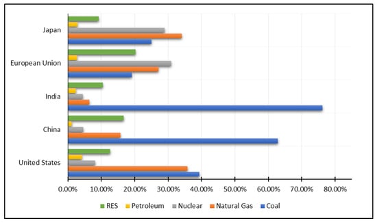 It can be observed in Figure 5 that coal has been a major energy production resource in many countries around the world, particularly in developing countries (India and China), where it is often the primary source of electricity. According to data from the World Bank, coal accounted for approximately 38% of global electricity generation in 2019, making it the most widely used fossil fuel for power generation []. In developed regions (US, Japan and Europe), the reliance on coal is often even higher, with many countries relying on coal for more than 50% of their electricity generation []. The use of coal for electricity generation has significant environmental impacts, including the release of greenhouse gases and other pollutants, which contribute to climate change and air pollution. Despite these impacts, the use of coal has continued to grow in many parts of the world, particularly in developing countries where economic growth and increasing energy demand have driven the expansion of coal-fired power plants. However, the U.S Energy Information Administration reported that the coal demand for electricity generation dropped to 10.7 quadrillion BTU from 14.26 quadrillion BTU in the previous year [].