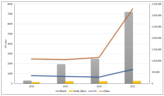 EV sales for developed countries (US) and developing countries (Brazil, South Africa, and China) from 2018 to 2021 [].