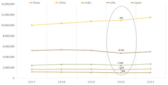 Sustainable energy development is critically important to reduce climate change, which is one of the greatest challenges nowadays. Additionally, sustainable energy development is important to ensure access to energy for quality-of-life reasons and for economic development. Governments and organizations worldwide were implementing policies and initiatives to reduce carbon emissions, increase the use of renewable energy and shift towards a low-carbon economy, before the outbreak of COVID-19. This led to an increased focus on developing and using renewable energy sources, such as solar, wind, and hydropower, as well as efforts to improve energy efficiency. Furthermore, there was also a growing awareness and concern among consumers and investors about the impact of energy production and consumption on the environment, which led to increased demand for sustainable energy options. Based on the data from The World Bank Group regarding the carbon dioxide (CO2) emissions, China, USA, India, Russia, and India are the world’s largest CO2 emitters []. The trend of CO2 emissions from these countries keeps increasing every year as shown in Figure 7. China is the largest emitter of CO2 in the world where the primary source of CO2 emissions is come from fossil fuels, most notably those that burn coal in power and industrial plants, whereas the USA is the second largest emitter of CO2 that came from transportation, power generation, and industry. Coal is the main energy source for India that contributes to CO2 emissions, meanwhile natural gas is the primary source of energy and power generation in Russia that make it the fourth-largest contributor to CO2 emissions in the world. In contrast, the primary source of CO2 emissions in Japan came from oil and nuclear gas [].