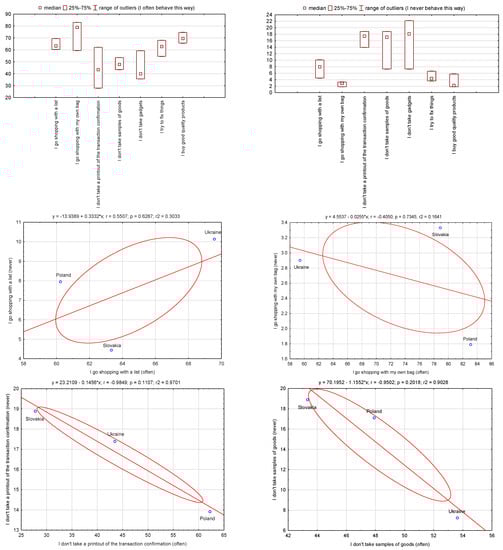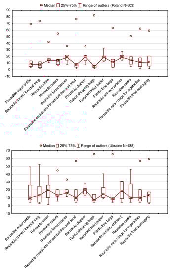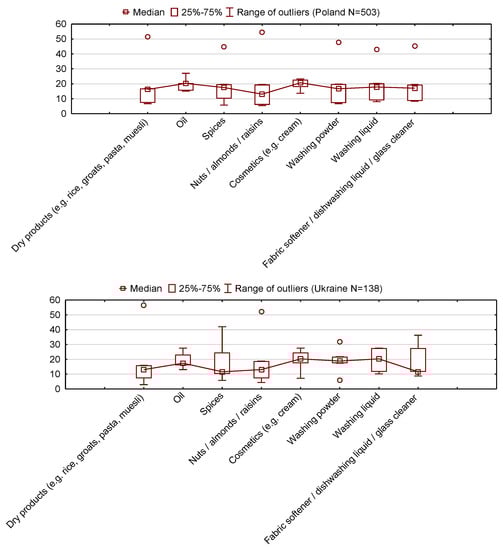 - In the case of the influence of the respondent’s country, non-significant differences were observed in the case of the purchase of unpackaged products (p = 0.3971 oil, p = 0.1191 nuts/almonds/raisins, p = 0.3266 cosmetics (e.g., cream), p = 0.2339 laundry detergent, p = 0.2944 rinse/dishwashing liquid/glass cleaner), use of reusable products (p = 0.6866 Straw). In other cases, a significant effect of the respondent’s country on responses was observed. Additional tests did not indicate differences between the groups formed according to the respondent’s country of residence.