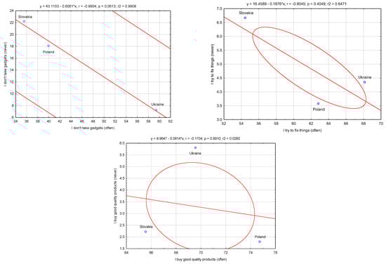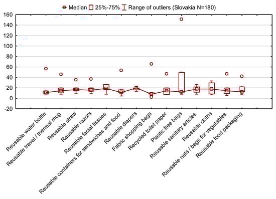 Respondents in Poland, Ukraine and Slovakia are most likely to use (5—very likely) fabric shopping bags. In addition, in the case of Poland, a high percentage of respondents declared they would be willing to use reusable containers for sandwiches and travel mugs. Respondents from Ukraine would be willing to use plastic-free bags and reusable food packaging. In contrast, respondents from Slovakia are most willing to use reusable water bottles and reusable containers for sandwiches. Furthermore, on the side of least willing to use products (1—not likely), respondents indicate mainly reusable diapers and reusable facial tissues (Table 7, Figure 3).