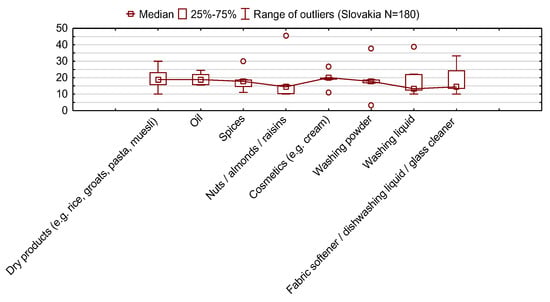 Respondents from Poland and Ukraine would be most likely to buy without packaging in the case of dry products (e.g., rice, groats, pasta, muesli;) and nuts/almonds/raisins (51.49% and 54.47% indications for Poland and, respectively, 56.52% and 52.17% for Ukraine). The highest percentage of respondents from Slovakia would be willing to buy nuts/almonds/raisins without packaging (45.56%), as well as washing liquid (38.89%). Respondents from all surveyed countries are the least likely to purchase products without packaging in the case of cosmetics (e.g., cream) and oil.