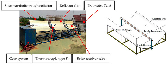The parabolic trough solar collector was constructed by using mirrors in the shape of a parabolic cylinder to reflect and concentrate solar radiation onto an absorber tube located at the focal line of the parabolic cylinder. The absorber tube absorbed the incoming solar radiation and transformed it into thermal energy. A conceptual schematic of the design of the component of the parabolic shape [55] is shown in Figure 1.