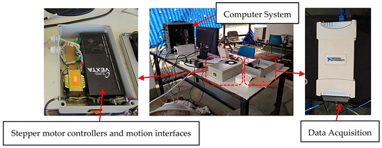 The SPT system is located in Nakhon Nayok Province, Thailand, at a longitude of 101.00° E and a latitude of 14.12° N. The time zone is UTC + 07, and its proximity to the equator makes it strategically placed. During experiments, the SPT system was positioned with its parabolic trough’s long axis aligned along the north–south direction. This positioning allowed the trough to collect solar radiation in the east–west direction throughout the experiment. The solar tracking system, shown in Figure 3, controlled the movement of the SPT unit. The solar tracking control system was created using LabVIEW version 2010 and was based on Equations (5)–(7), enabling the programming of position and time settings. The SPT was initially oriented east as the starting position. To start the program, the user had to input the location, time zone, and local time into the software. Once these settings were in place, the program was ready to operate. The system then tracked the daily trajectory of the Sun by rotating the SPT axis from east to west at a constant speed of 0.00415 degrees per second using a stepping motor (ORIENTAL model PH599-A, Manufactured by ORIENTAL MOTOR CO., LTD., Tokyo, Japan) connected to a gearbox designed for a total rotation of 15 degrees per hour [56]. At the end of the day, the SPT returned to its starting position.