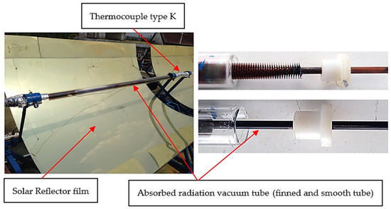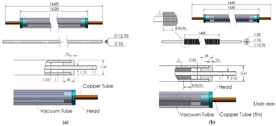 The components and geometric parameters of the solar absorber vacuum tube assembly used for the experiment are shown in Figure 4. Two types of absorber tubes were evaluated, specifically, (a) smooth copper tubes and (b) finned copper tubes. The absorber tubes were mounted coaxially within an evacuated glass tube. The vacuum enclosure reduced thermal losses from the absorber tube. The design parameters of the tubes are shown in Table 2.