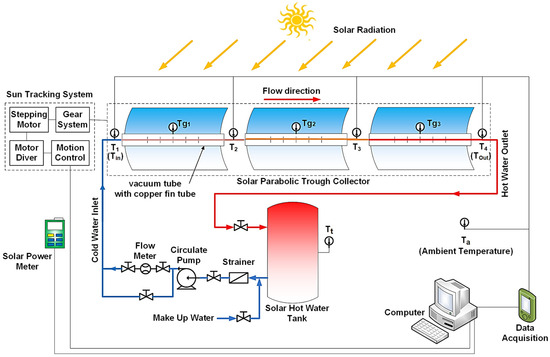 The experimental system described in Limboonruang et al. [55] was used to conduct the experiments. The solar parabolic trough collector (SPTC) system was set up with the long axis of the parabola oriented along the north–south direction. The parabolic trough would therefore collect solar radiation in the east–west direction. The experimental system comprised three SPTs as shown in Figure 2, each measuring 1200 × 1520 mm2 with a 300 mm focal length, which concentrated sunlight at the focal point. The components of the collector and solar parabolic trough assembly were as follows: (i) solar receiver vacuum tube, (ii) solar parabolic trough collector, (iii) solar hot water tank, and (iv) Sun tracking system. The components and schematic diagram of the system are shown in Figure 2. The solar tracking system for the SPT is shown in Figure 3, and the characteristics of the SPT are shown in Table 1.