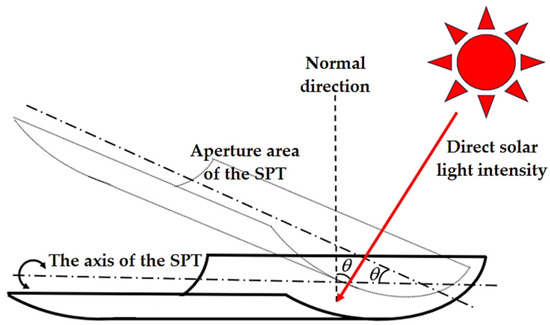 The experiment was conducted from 11 to 30 March during Thailand’s summer season. This corresponded to day numbers (n) 70 to 89 for the year. Using Equation (5), the declination angle (δ) of the Sun was calculated to be between −4.41° and 3.22°. Equation (8) [56] illustrates the angle of incidence for the SPT on a north–south axis with a continuous east-to-west trajectory. The resulting calculation showed an angle of 0.997 ≤ cosθ ≤ 0.998.