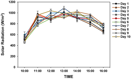 Figure A1 shows all the data on solar radiation collected on clear and cloudy days throughout the experiment. It can be seen that experimental data collection was conducted for 20 days. However, 10 days of the data with the least cloud cover were used for the analysis as shown in Figure 8.