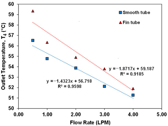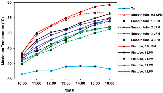 Figure 9 shows the effect of varying the flow rate of the water in the smooth and finned copper absorber tubes. The data were obtained by running the experiments at different flow rates, ranging from 0.5 to 4 L per minute. As expected, the fluid outlet temperature decreased with an increase in the flow rate, and it can be observed that the finned tubes consistently provided a higher outlet temperature than the smooth tubes at the same flow rate. It can be seen that a maximum outlet temperature of 56.52 °C at 0.5 L per minute was achieved for a smooth tube, and a maximum outlet temperature of 59.34 °C at 0.5 L per minute was achieved for a finned tube. The average daily ambient air temperature was 38.20 °C. Therefore, the results show the effect of the mass flow rate and temperature difference. Higher temperature differences result from lower mass flow rates because the working fluid spends a longer time receiving energy at a lower water velocity. Since the primary function of the SPT collector is to provide heat, running the collector at a lower flow rate is more beneficial in terms of higher outlet temperatures. Furthermore, because a lower flow rate implies a reduced pumping power requirement, the overall system efficiency improves as shown in a prior study [67,68]. However, a solar receiver at a higher temperature implies a higher rate of heat loss from the solar absorber. As indicated in previous studies [28,69], heat loss can be reduced by installing insulation on the solar receiver’s surface, which will decrease the temperature of the solar receiver and minimize the overall heat loss.