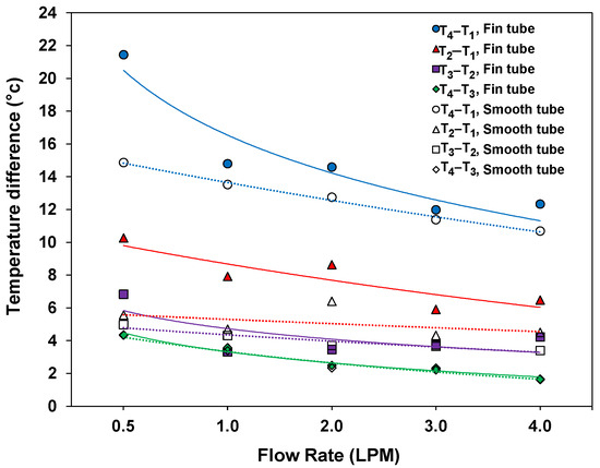 Figure 11 shows the series of increasing temperatures (“Temperature Difference”) between the measuring points in the absorption tube: , , , and . It can be seen that the total number of temperature differences, was equal to the temperature difference between the temperature sensors, i.e., . There was a significant temperature difference between T2 and T1 compared to points T2 and T3 as well as T3 and T4. This was due to the fluid passing through the insulation before entering the absorber tube, which caused a significant difference in the early stages. However, when the fluid passed through the absorber tube, the flow conditions became more similar, resulting in a lower temperature change in the subsequent period. The experimental results are plotted at different flow rates for the smooth and finned copper tubes. As expected, the temperature difference decreased with an increase in the flow rate, achieving the maximum temperature difference at a flow rate of 0.5 L per minute. It was also found that the temperature difference of the finned tubes was higher than that of the smooth copper tubes, which was true for all the flow rates. This was due to the greater heat-absorbing area of the finned tube. This is consistent with another published study [29,30,70]. Furthermore, the length of the SPT collector affects the temperature difference and efficiency. A longer system will enhance overall efficiency, albeit at the expense of requiring more pumping power due to increased frictional losses.