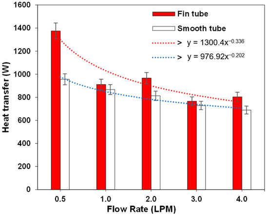 Figure 12 shows the heat transfer as a function of the water flow rates for the smooth and finned copper tubes. It can be seen that the heat transfer rate in the smooth absorber tubes was almost constant for all the flow rates; however, there was a significant difference in the finned absorber tubes, especially at lower flow rates. The results show that the finned tubes achieved a heat transfer rate of 1375.55 W at the low flow rate of 0.5 L per minute, 43.9% higher than that of the smooth tubes at the same flow rate. This was because the surface area for absorbing the solar radiation was much larger (due to the fins) than the surface area for the heat transfer between the working fluid and the tube. The results therefore suggest that externally finned tube absorbers need to be operated at low flow rates to maximize their useful energy output. Furthermore, this result illustrates the need for the modelling of the heat transfer in this sort of system, given the fact that conventional correlations are unlikely to be applicable.