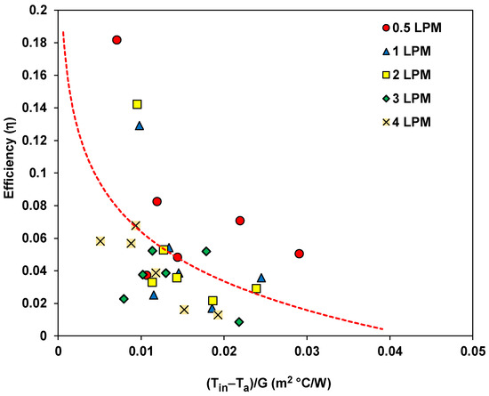 Figure 14 presents a thermal performance curve based on the data collected throughout the experiment. The line of the least squares fit equation is shown in the graph and indicates that the collector had an intercept efficiency of about 18%, which is much lower than expected, as established in earlier studies [74,75,76] and that it reduced with the flow rate. It can be observed that, as the mass flow rate increased, the term “(Tin−Ta)/G” increased, resulting in a decrease in efficiency. Therefore, it can be seen that the change in efficiency depends on the parameter of the temperature difference in the term “(Tin−Ta)/G”.