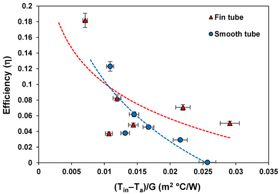 Figure 15 shows that a tube with external fins consistently outperforms a smooth tube in a solar receiver. The trend of the efficiency with the term “(Tin−Ta)/G” observed in this study is similar to that found in earlier research [75,76,77]. It can be observed that the efficiency was much higher at lower values of the term “(Tin−Ta)/G”, which further supports the suggestion that a lower performance at higher flow rates is a result of increased heat losses. This is because the losses will be proportional to the temperature difference between the fluid and the ambient air. Additionally, Table 7 compares the efficiency and heat transfer parameters for both cases, finned and smooth tubes. The finned solar absorber tube was about 48% more efficient than the smooth tube, mainly due to improved energy absorption.