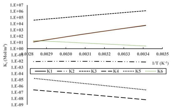 Equation (3) represents the main CO2 absorption reaction by MEA. The reaction proceeds through a non-elementary mechanism that leads to the formation of an MEA carbamate () and protonated MEA (). Equation (5) represents the main CO2 absorption reaction in alkaline solutions. Equation (4) has been added for completeness as its contribution to absorption is almost negligible compared to Equation (5). The rest of the equation has also been added for completeness; however, these equations can explain some interesting behavior of the absorption system that was observed experimentally. A list of all chemical compounds present in the gas and liquid phases is included in Table A1 in Appendix A. A complete list of formulas used to calculate the equilibrium constant values is shown in the Supplemental Information (SI) file. Using these formulas, we calculated equilibrium constant values vs temperature, and the results are shown in Figure 1. The calculated values have been plotted using a logarithmic scale to depict values that differ by several orders of magnitude. In the logarithmic plot, the temperature variation with the inverse of temperature (1/T) is given by a straight line. Positive slopes represent exothermic reactions, while negative slopes represent endothermic reactions. The results in Figure 1 can be used to analyze the temperature behavior of all the chemical reactions involved in the process. The CO2 absorption reactions, Equations (3) and (5), are highly exothermic, while Equation (4) is almost independent of temperature variations, and the other reactions, Equations (6)–(8), are endothermic. The variation in the values of the equilibrium constants with temperature will be a key factor in evaluating the behavior of the reaction scheme given by Equations (3)–(9).