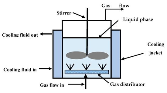 Considering the complexity of thermal management in packing columns, we decided in this project to use a two-phase semi-batch reactor. This reactor is widely used in industry, especially in biotechnology-related operations [31]. The liquid phase is stationary, while there is a continuous flow of a gas phase. This reactor, see Figure 2, has a jacket that allows good cooling and/or heating conditions. The presence of a mechanical stirrer and appropriate baffle design helps to achieve good mixing and homogeneous property values. The gas phase is introduced through a distributor that allows the formation of bubbles of a certain size and controls the bubble size distribution. The bubbling gas phase also produces agitation of the liquid phase, contributing to further reduction in heat and mass transfer limitations [31,32,33]. High gas–liquid heat and mass transfer areas can be achieved by the selection of small bubble diameters [34].