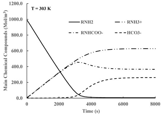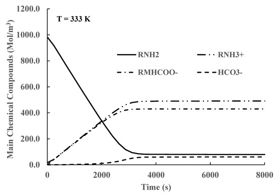 In Figure 3, it is shown that the CO2 absorption by MEA, Equation (3), is the main reaction until 3000 s. This reaction consumes MEA () while producing approximately equivalent amounts of carbamate () and protonated MEA (). At longer times, the amount of MEA is very small, and the production of becomes the main reaction. The carbamate () concentration decreases by the reaction given by Equation (8). After times longer than 6000 s, equilibrium is reached. This behavior agrees well with the values of the equilibrium concentrations reported in references [4,41] for the case of CO2 loads bigger than 0.55.