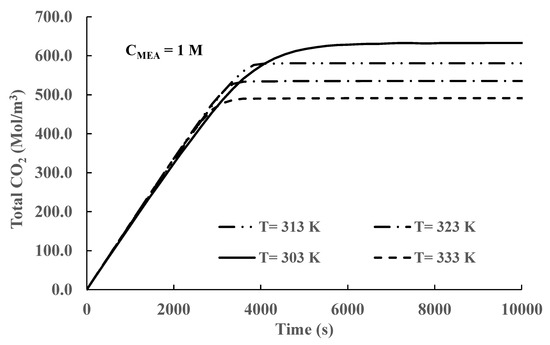 Time variation in total CO2 concentration in the liquid phase for different temperatures (Initial CMEA = 1 M).