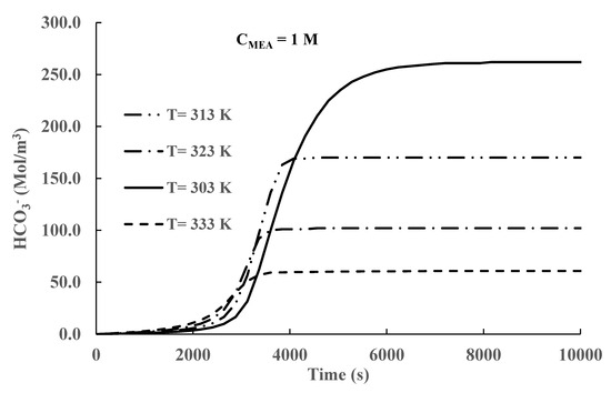 Time variation in bicarbonate concentration in the liquid phase (Initial CMEA = 1 M).