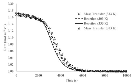 The results depicted in Figure 5 show that at short and medium times, the amount of CO2 absorbed is practically independent of temperature at short times, and there is a small increase as the temperature increases until equilibrium is reached. To find the reason for this unexpected behavior, we carried out simulations calculating the absolute values of mass transfer and reaction rates for all times. Typical calculated results are shown in Figure 7. At short times, both the mass transfer and the reaction rates have the same value. The developed computer code operates by comparing both values and selecting the smaller value. This value determines the controlling mechanism, kinetic or mass transfer control, and then calculates all concentrations using the controlling mechanism value. In conclusion, an equal value means that the system is mass transfer controlled. At short times, mass transfer rates increase only slightly with increasing temperature, and the calculated concentration values at different temperatures are very similar. At longer times, the reaction rate decreases in value due to the decrease in reactant amount () and the system becomes kinetically controlled; however, CO2 absorption is driven by the value of Equation (3) forward specific reaction constant that increases in value as temperature increases. Once equilibrium is reached, the value of the CO2 absorbing species is determined by the values of the equilibrium constants that are higher for smaller temperatures.