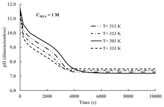 The variation in pH with time and temperature is shown in Figure 9. The results presented in Figure 8 show that, for a constant temperature, the pH decreases continuously as CO2 is absorbed. However, for different temperatures, the pH values increase as the temperature decreases during the transient period at time values smaller than 6000 s. After equilibrium is reached, time > 6000 s, the pH values decrease as temperature decreases.