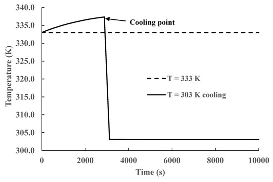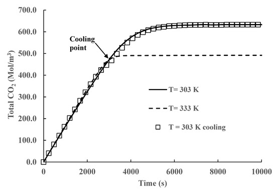 The results presented in Figure 5, Figure 6, Figure 7, Figure 8 and Figure 9 and Table 2 demonstrate that CO2 absorption increases as the liquid phase temperature decreases once steady state is achieved. The extra amount absorbed is more than 28 % with respect to operation at the highest temperature (333 K). The behavior is produced by the increase in the equilibrium constant values given by Equations (3) and (5). This finding creates the possibility of increasing absorption by reaction temperature manipulation. However, some practical problems remain. In all our simulations, we maintained the liquid phase constant by adequate cooling. In typical industrial processes, the gas phase is at high temperatures [27,28]; therefore, a significant energy expense could be required to achieve the necessary lower temperatures. Procedures to reduce this cost are necessary. Inspection of Figure 5, Figure 6, Figure 7, Figure 8 and Figure 9 shows that, for this reactor, CO2 absorption is cumulative and reaches an equilibrium (saturation) value beyond which there is negligible additional absorption. An analysis of the heat transfer processes in the liquid phase shows that there are three main heat transfer mechanisms: heat generated by exothermic chemical reactions, heat used to vaporize the molecules of liquid solvents, and sensible heat exchange between the gas and liquid phases. The solvent temperature increases by the heat released by the exothermic reaction’s decrease due to the latent heat of vaporization of the solvent into the gas phase and typically will increase or decrease by heat transfer between the gas and the liquid phases. Considering the three heat transfer mechanisms, a moderate increase in the liquid temperature can be expected in most practical cases. If this is the case, it is possible to start reactor operation without cooling and start the cooling process later. The energy savings by not cooling the reactor at short times can exceed the extra energy expenses by starting to cool the reactor at longer times or higher temperatures. Extra energy savings can be obtained by stopping reactor operation once equilibrium is achieved. This cooling strategy was tested by running simulations where no cooling was applied for the first 3000 s, and at that time, cooling heat transfer was started. The results are presented in Figure 10 and Figure 11.